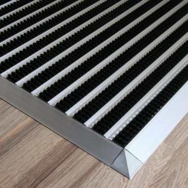 Aluminium entrance mat. 9 mm high. 33 mm wide. Brushes finish. Ramps.